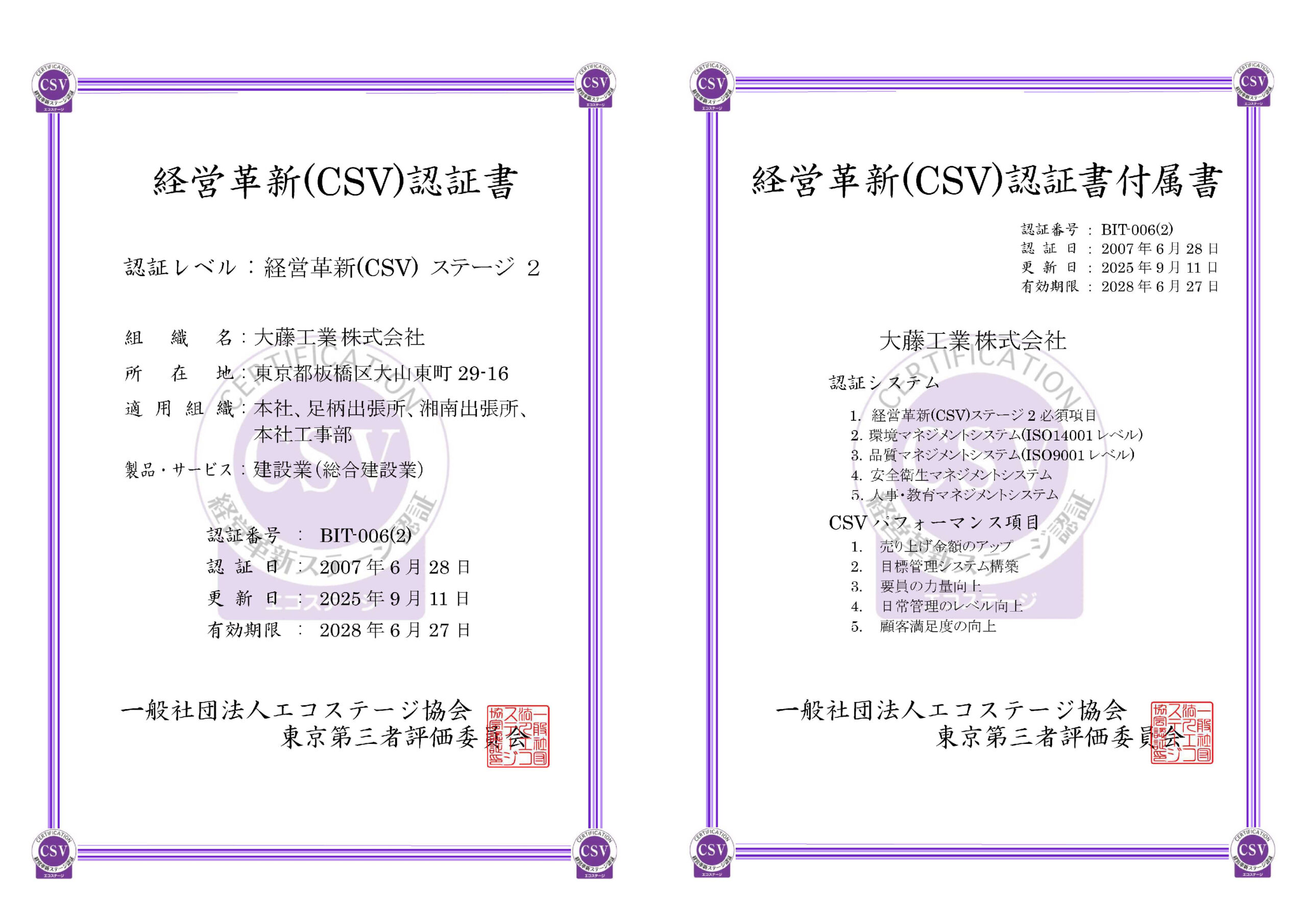 私たちは、次代の地球環境を守るため、「エコステージ:CSV(経営革新ステージ)」を取得しました。この認証は、環境保護と持続可能な発展に向けた私たちの取り組みを証明するものです。エコステージは、環境への配慮を経営の中心に据え、経済的価値と社会的価値を両立させることを目的としています。
